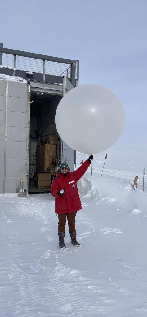Photo taken at Amundsen Scott South Pole station. Twice a day, the team launches a weather balloon! Attached to the balloon is an instrument called a radiosonde that measures temperature, pressure, humidity, wind speed, and wind direction throughout the atmosphere as the balloon ascends. Typically the balloon will reach 25,000-29,000 meters before bursting.